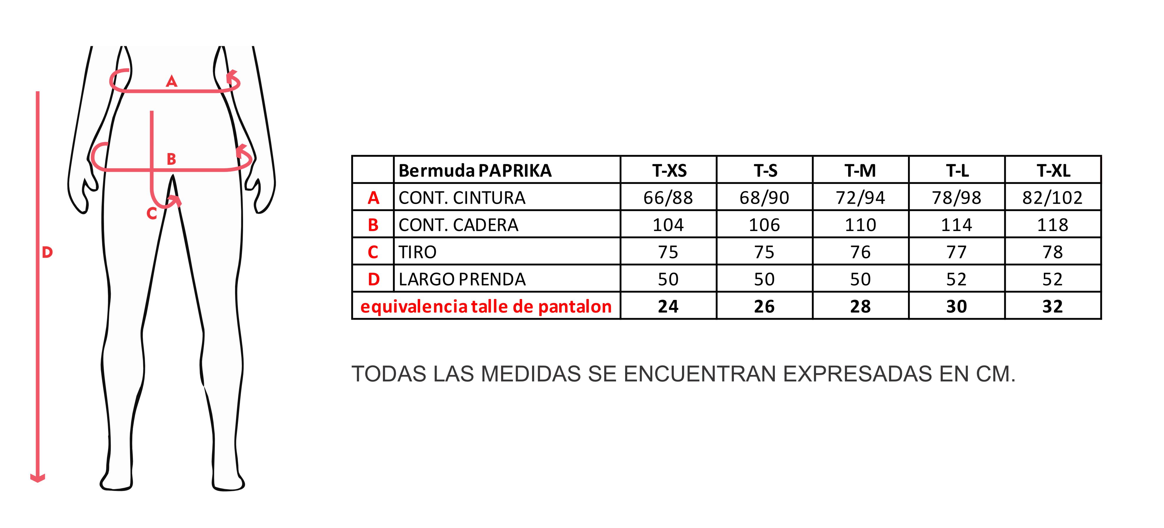 Tiene bolsillos laterales y cuenta con un ruedo que permite girarlo hacia arriba y acortar la bermuda según la preferencia de la clienta.