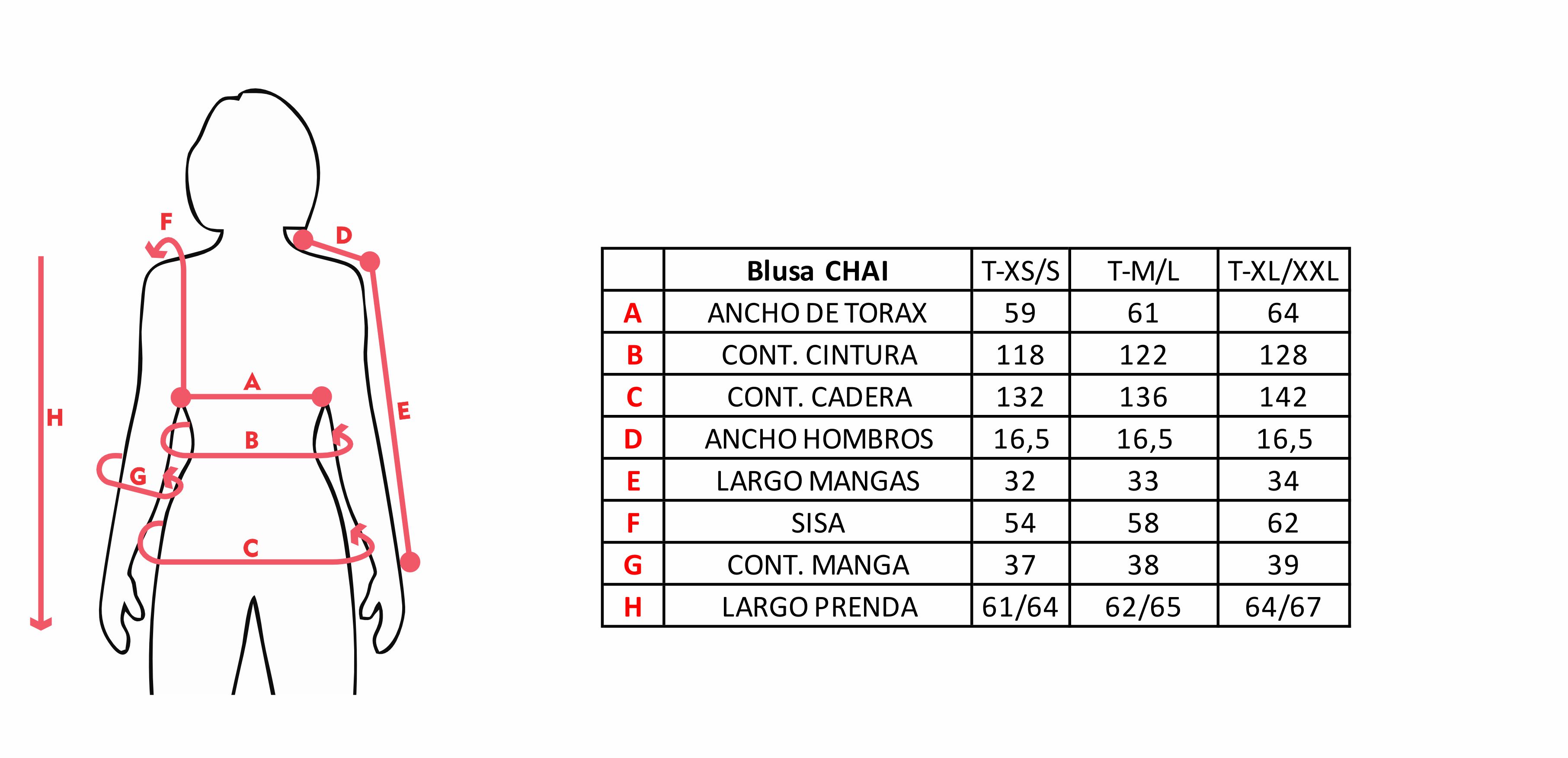 Blusa con calce suelto y corte recto. Presenta escote en V con detalle de cuello mao. Mangas ¾ y terminación con ruedo ancho. Es más corta adelante y más larga atrás.