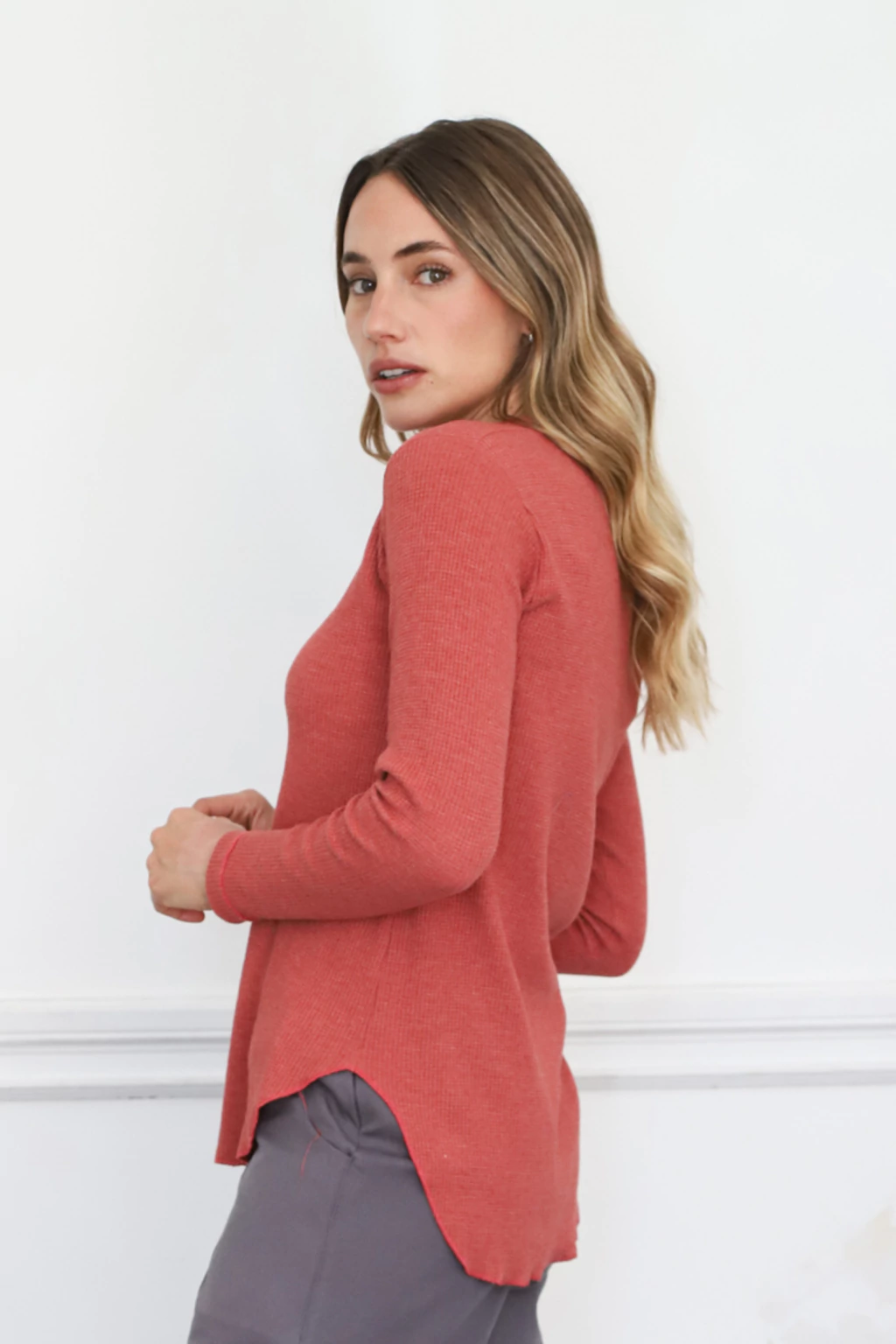 Esta confeccionada en waffle de algodón con un poquito de elastano, la terminación en delantera y espalda es redondeada. Las costuras son al corte remalladas con overlock al tono.